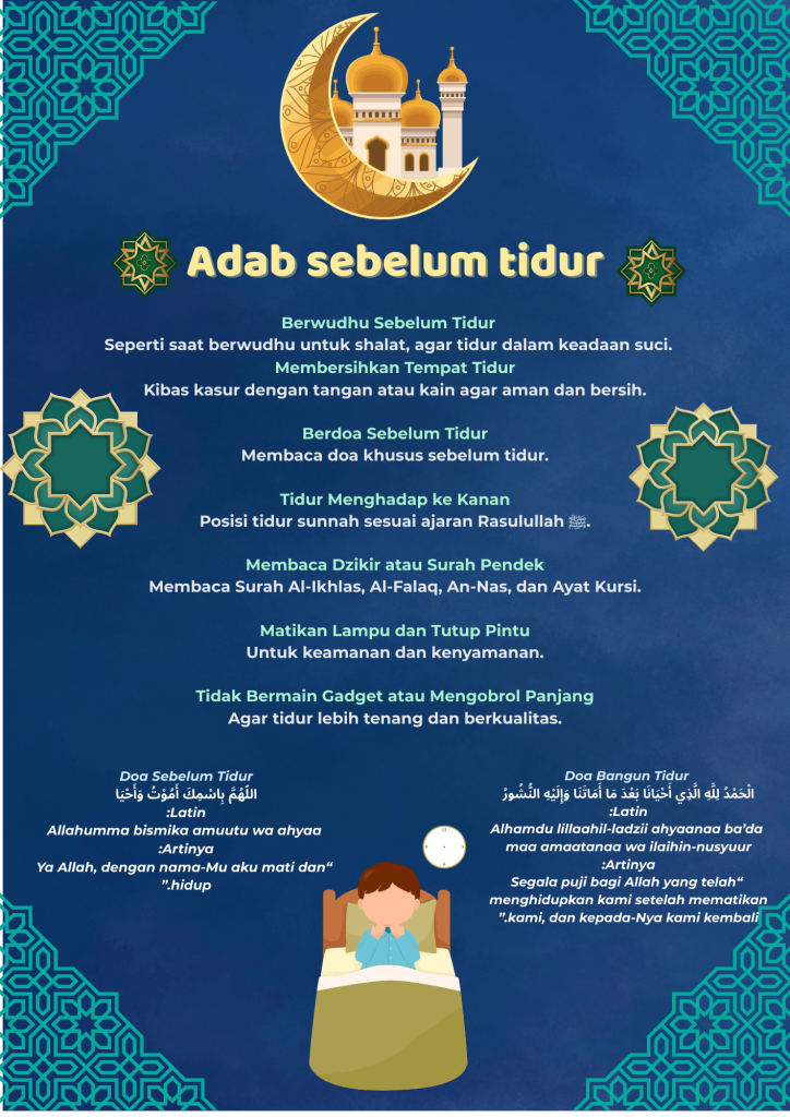 This poster is made for  reminding us the attitude or maner before sleep, because this is important because we follow rassululah way to sleep and can get reward in akhirat later