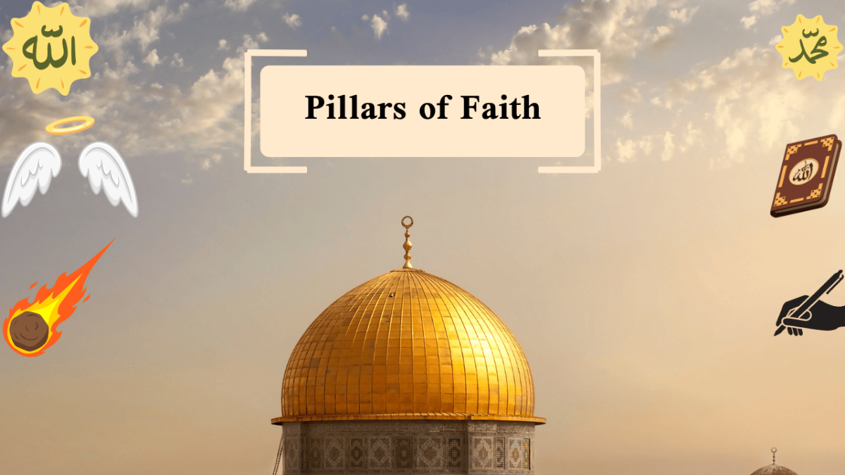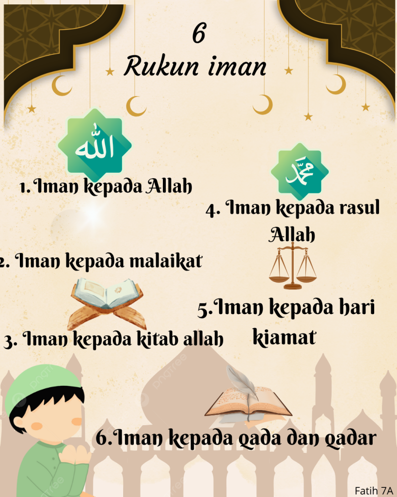 “poster rukun iman”, This poster is made to remind us for all of the pillars of faith, the first is allah because he is the god that make everything, angel because they always write our sins and reward, the holder of the trumpet and the one who take our soul with god permission, the third is the holy book or the al qur’an because all the sharia,rule,story of islam and all of the islam are in the book, the fourth is the rasul (prophet) especially prophet Muhammad Shalallahu ‘Alaihi Wasallam because they spread the tauhid and closed by prophet muhammad SAW who spread and make islam religion, the 5 is the judgement day because it underscores the ultimate accountability of every individual before Allah for their actions, promoting a life of righteousness, responsibility, and virtue, the last is qada and qadar because  for a complete belief in Allah, promoting trust, acceptance, and resilience in adversity