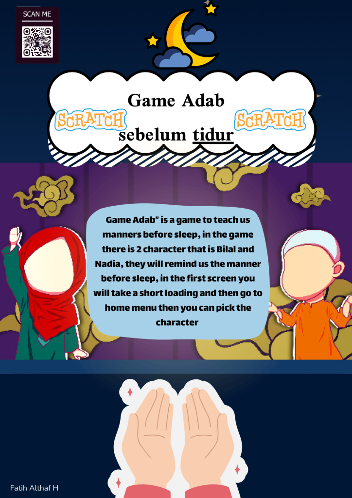 “Game Adab before sleep or in English “Manners before sleep” is a game that make from scratch, the genre is education and roleplay, the game is about 1 boy named bilal and 1 girl named nadia, the want to sleep but by following the sunnah,hadits and manners before sleep,when you press the green flag you will start and have some loading at idn superkidz background afterthat you will be in play screen, you need to click play button adn than you go to pick character screen then you can pick 2 people, bilal and nadia, the only difference of bilal and nadia only the design but the fill is the same, after pick on of that you will given the manners before sleep from slide 1-10, there are 3 button, the first is next button, by clicking that you can go to the next slide, the other one is the back button, if you press that you go back to the previous slide and the third button is home button, with that you can go back to “pick your character” screen.