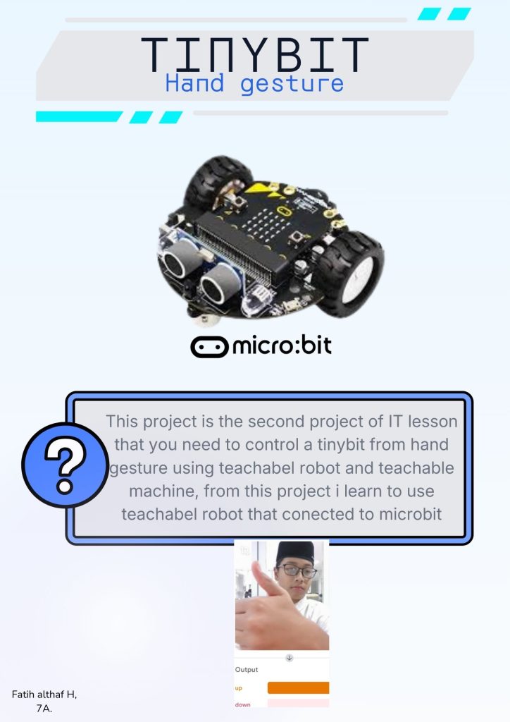 For this second project of IT, i will learn about hand gesture that later can controll the tinybit trought teachable machine that later be used in teachable robot web, for this project i use the up, down, left, right gesture from the teachable machine, the teachable maschine  use the sample of me for thumb up to go forward/up and thumb down to go sown/backward, this project is very easy, you only need to use the teachable machine and teachable robot and boom! you can do it