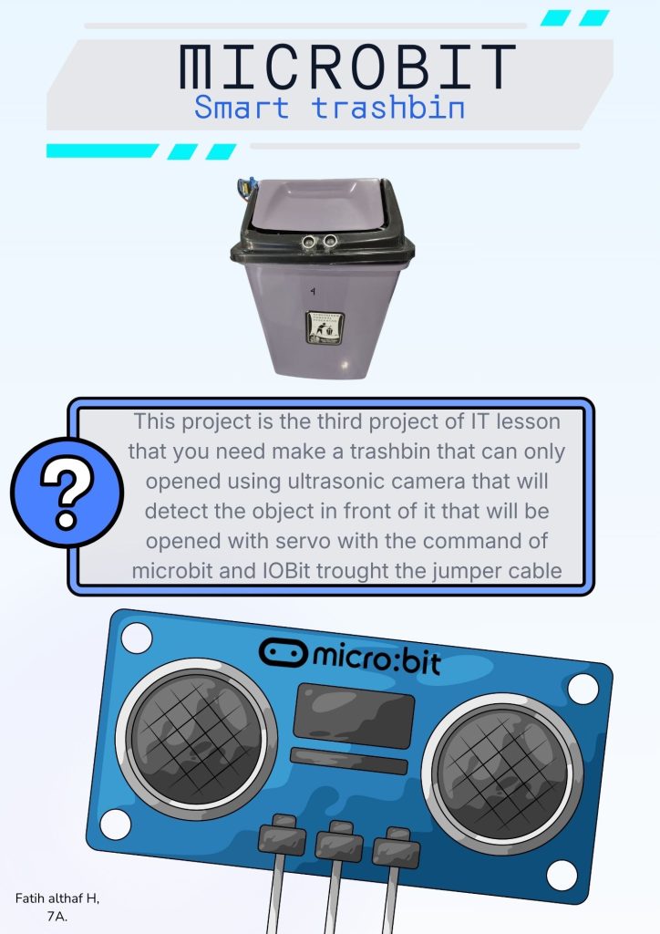 This project is a littlebit unique, becaues you need to make an trashbin that will automatically open using ultrasonic camera that is called “Smart trashbin” in this project i learned to connect ultrasonic camera, microbit, IOBit and servousing jumper cable, this project is easy but the servo sometimes error or even broken but the rest of the code and component is good as usual, this project is very fun because i learned automatication